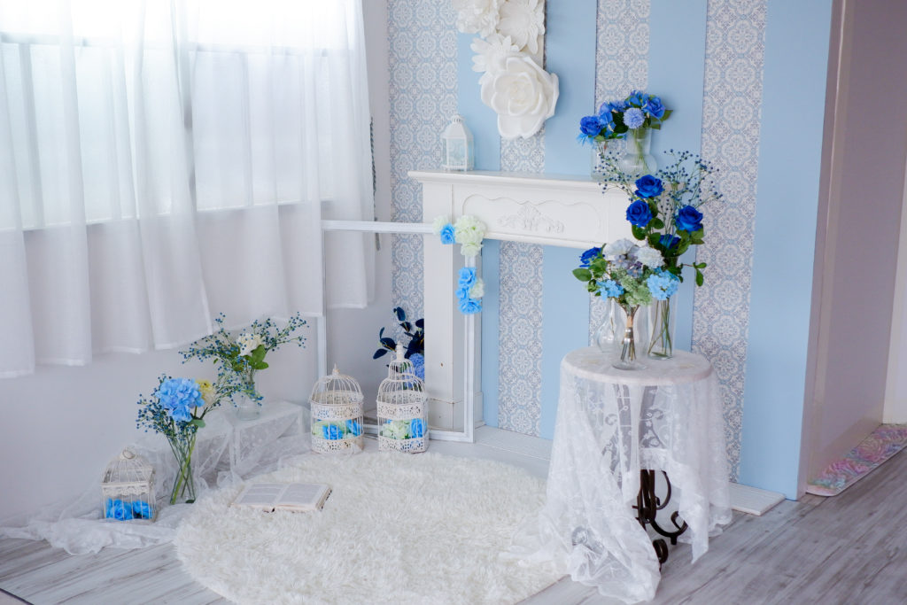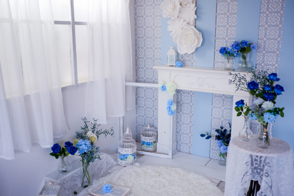 今までのブール基調を継承しながら、青い花々とクラシカルな小物に囲まれた小庭をイメージした空間を演出。ロリータ、メイドなどの衣装が映えるブースになりました!いままでスタジオご利用頂いたお客様にも、新たな作品撮りを楽しんで頂けます。